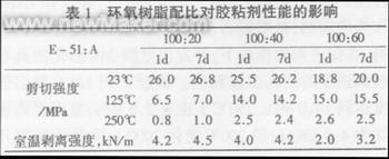 由表1可见,E-51:A=100:40时胶粘剂综合效果较好,增加A的用量,虽然可以提高耐温性,但室温强度下降,而且由于A的粘度较大,加入量太大会增大体系的粘度,与被粘接表面浸润不好,造成强度低,工艺性差。