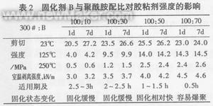 在低分子聚酰胺树脂固化环氧树脂的体系中,通过添加一定量的高活性耐热固化剂B,直接影响该体系的固化状态及其强度。实验证明,耐热固化剂B与低分子聚酰胺的协同效应在一定范围内对固化物强度有较大提高,但并非加量越多越好。改变300#聚酰胺和固化剂B的配比,按1.3.2加入促进剂,分别固化1.3.1制得的改性环氧树脂,观察强度和固化状态变化见表2。