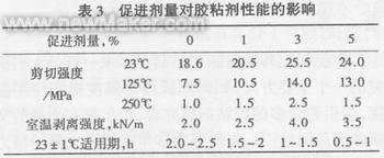 从表3可见,促进剂用量少反应速度慢,体系固化效果不好,难以在短时间内达到较高的强度;促进剂的用量过多,体系的固化速度提高,分子排列规整度下降,强度也会下降,影响胶粘剂的耐高温性能。综合以上的分析,选择促进剂为3%份左右效果较好。