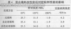 本实验采用石棉和高岭土作为混合填料,将微米级的石棉和高岭土高温烘干,用KH-550进行有机活化处理,然后再分时间段进行高温烘干,最后真空干燥。分别按环氧树脂重量的5%加入未改性和活性处理的混合填料。室温固化1d,测剪切强度和剥离强度见表4。