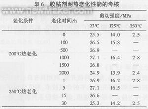 从表6可见,胶粘剂经过200℃老化2000h和250℃老化30h后,剪切强度几乎不率减,可见该胶粘剂耐热老化性能优异。