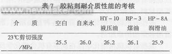 胶粘剂固化1d后用不同介质浸泡30d后测试室温剪切强度,见表7: